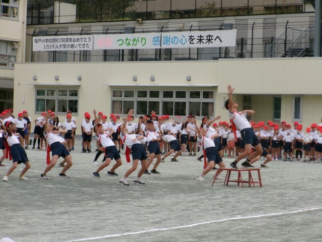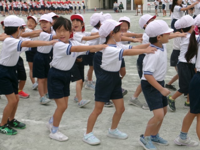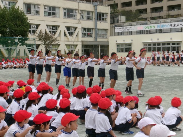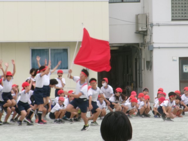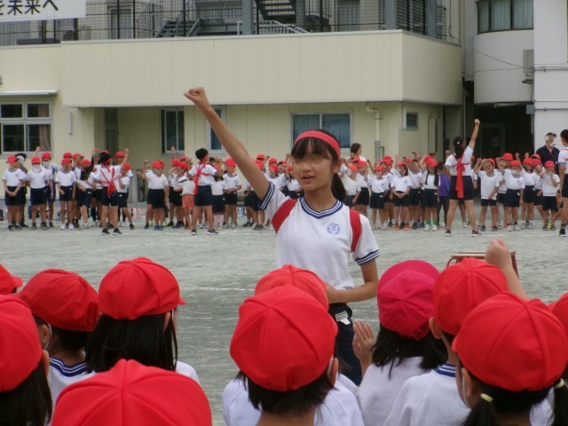 赤白隊形に分かれ、応援合戦の流れをつかみました。応援団が日々の練習の成果を出し、元気よく入場すると