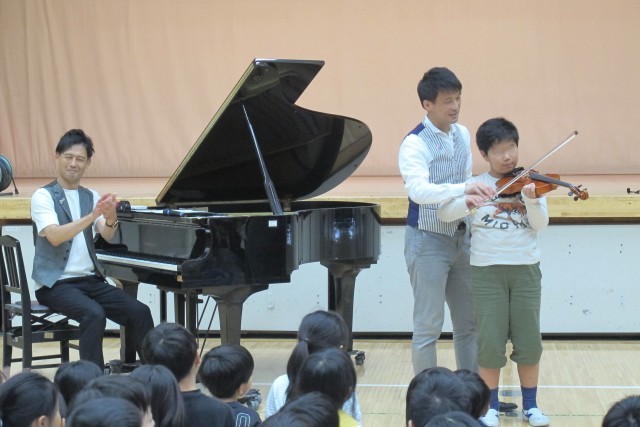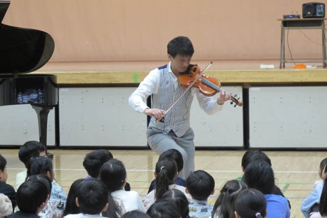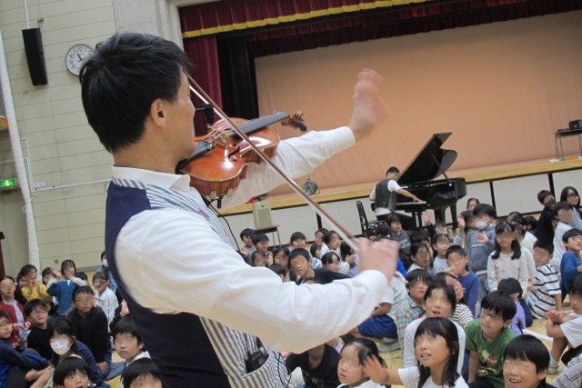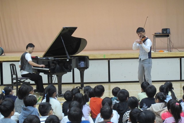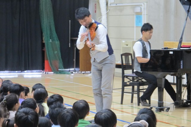 音楽グループEverly(エバリー)さんから、松尾兄弟に来ていただき、1、2年生とみのり学級の皆でミニコンサートを楽しみました。エバリーさんは、日本全国のホールでコンサートを行いながら、小学校での演奏も年間500校行っています。トルコ行進曲、ルパン三世のテーマ、ディズニーメドレーなどの迫力ある生演奏や、バイオリンの楽器体験コーナーなどの参加型イベントに、子どもたちは大盛り上がりでした。
