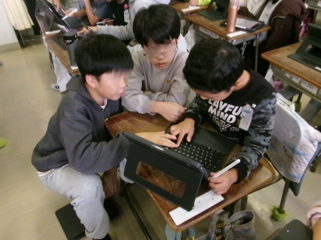 1年生は、6年生からタブレットの使い方をやさしく教えてもらいました。「ロイロノート」やカメラの使い方を学び、楽しそうに使っていました。