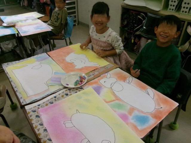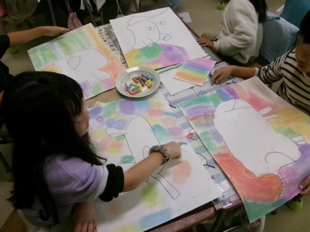 画用紙にぞうを大きく描き、自分の思った色を選んでいました。チョークを使うと背景が淡い色に