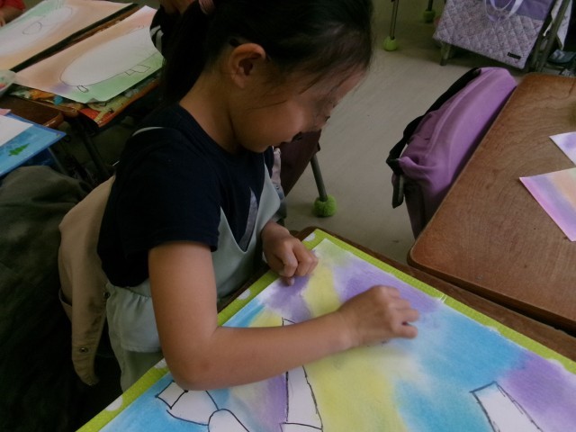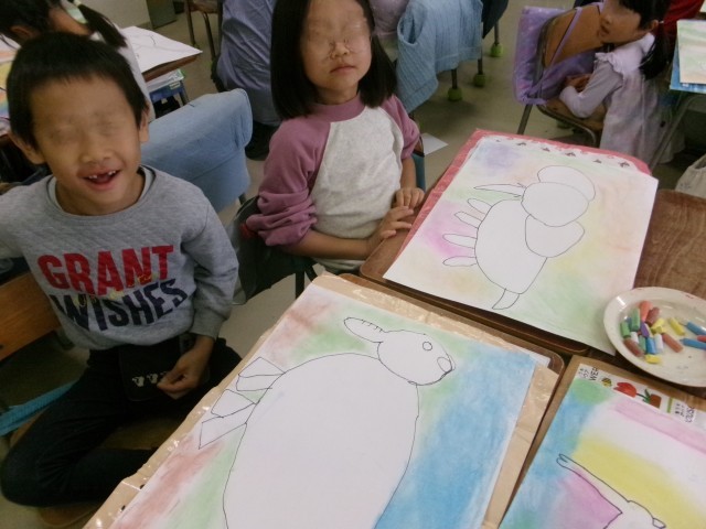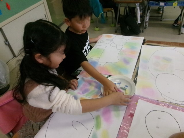 チョークを使ってぞうを描く作品です。今日は、背景を塗る時間です。