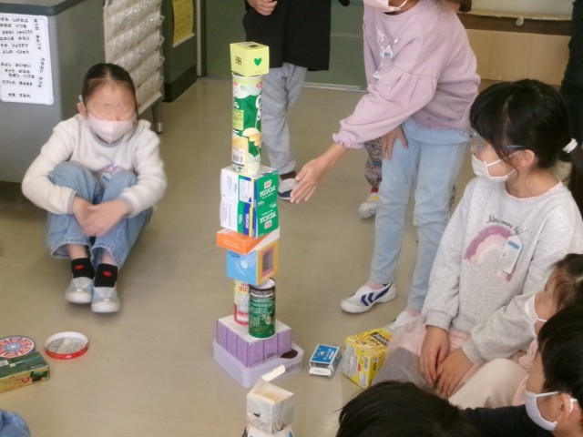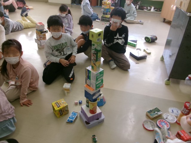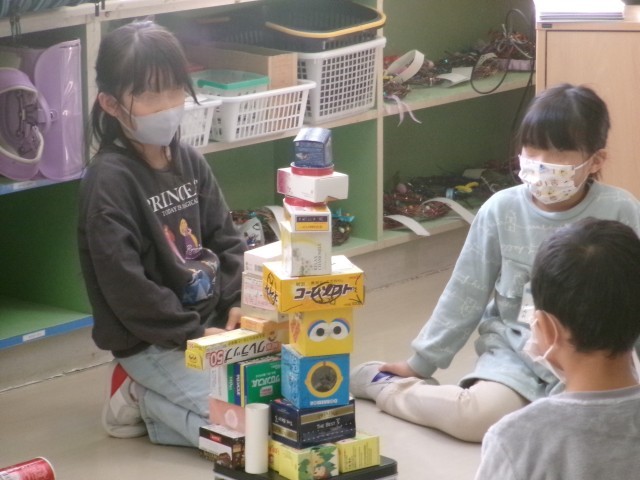 ドミノ倒しをしたりして楽しみました。さらに、箱の特徴を使って、ワニを作ったりしていました。