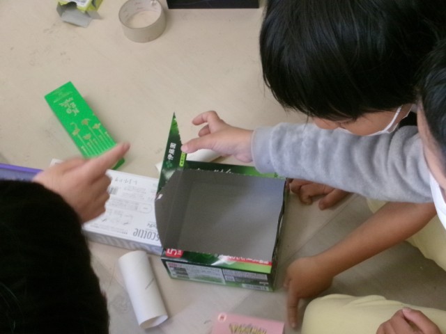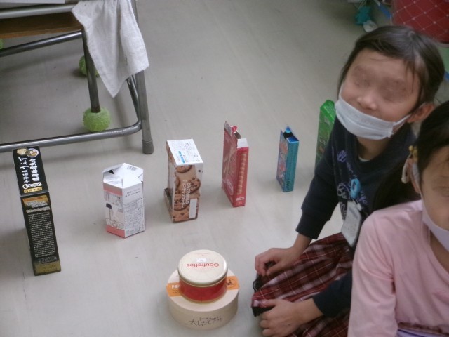 身の回りにある箱を使って、いろいろなかたちの特徴を学びました。