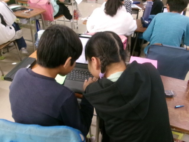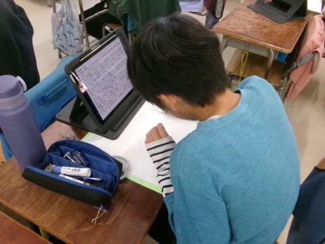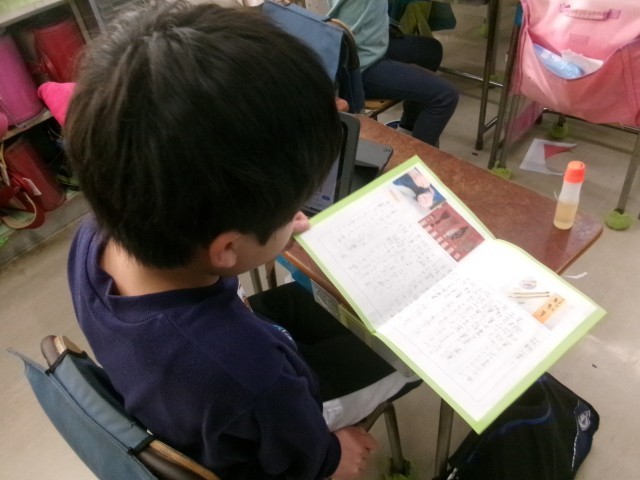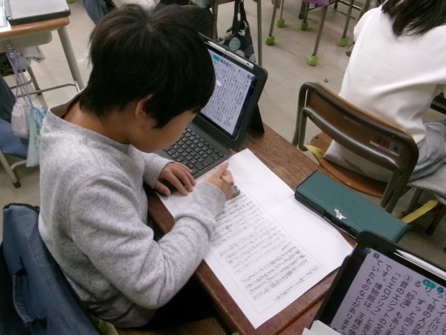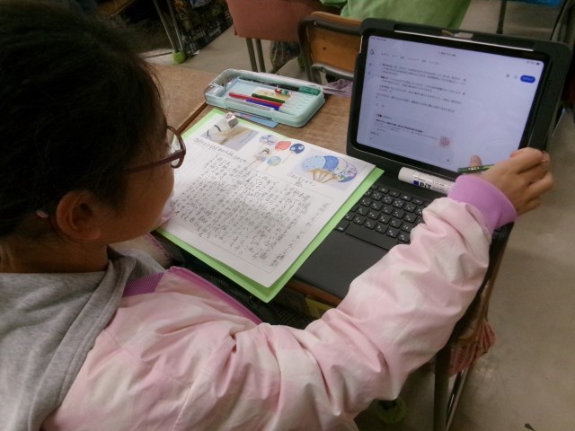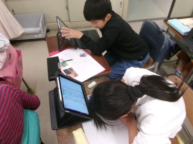 4年生の国語「未来へつなぐ工芸品」の授業です。自分が興味をもった工芸品を調べ、パンフレットにまとめていました。
