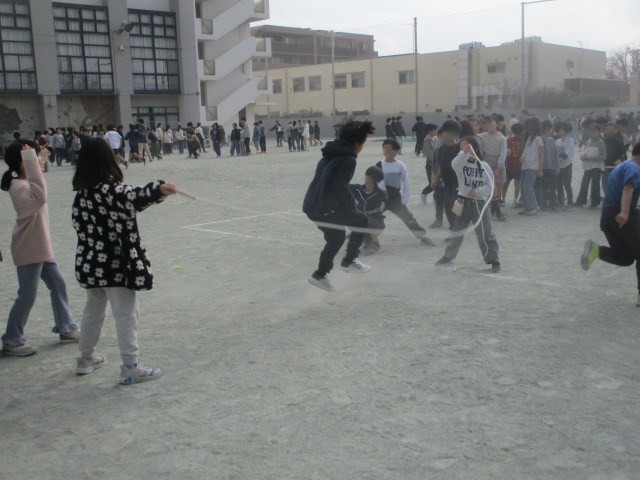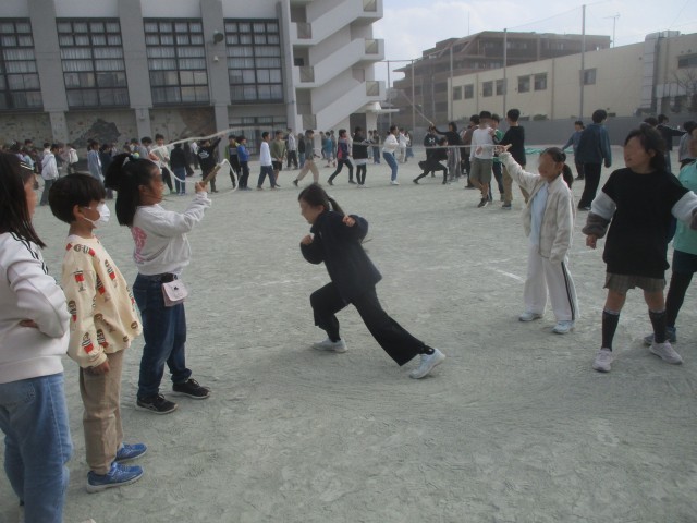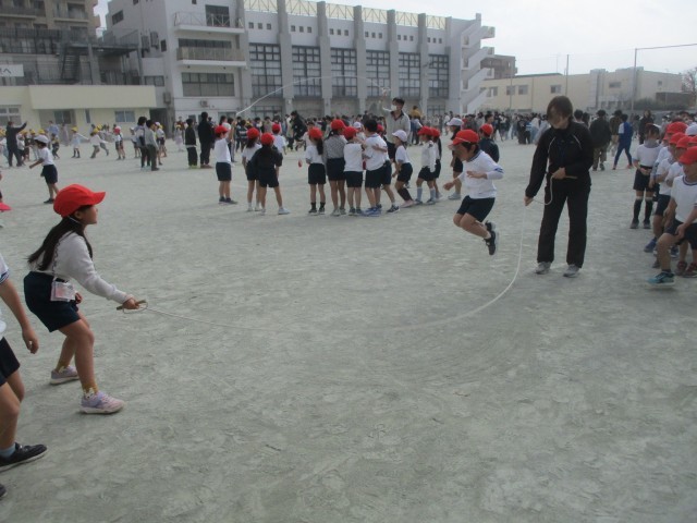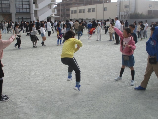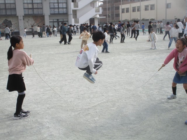 各クラスが校庭に出て、長縄の記録を出すために協力して取り組んでしました。