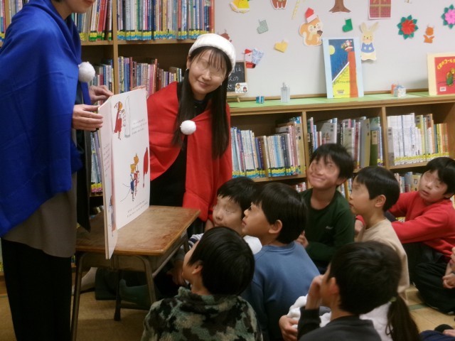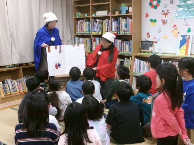 中休みは、図書室でPTA読書ボランティアどんぐりのみなさんによるクリスマス読み聞かせが
