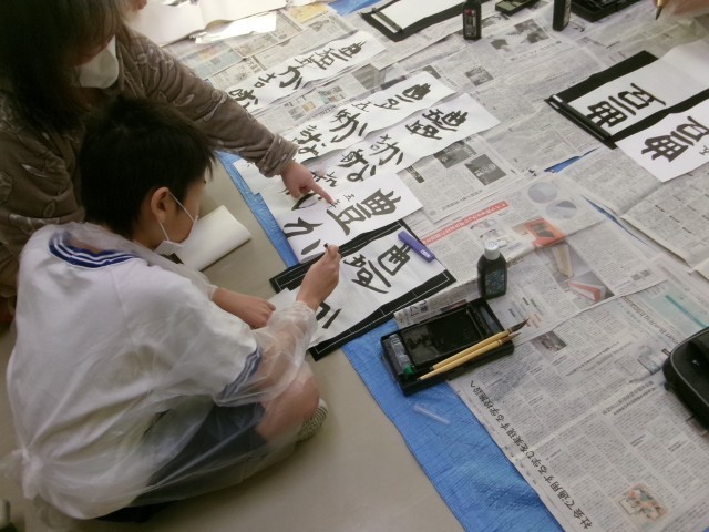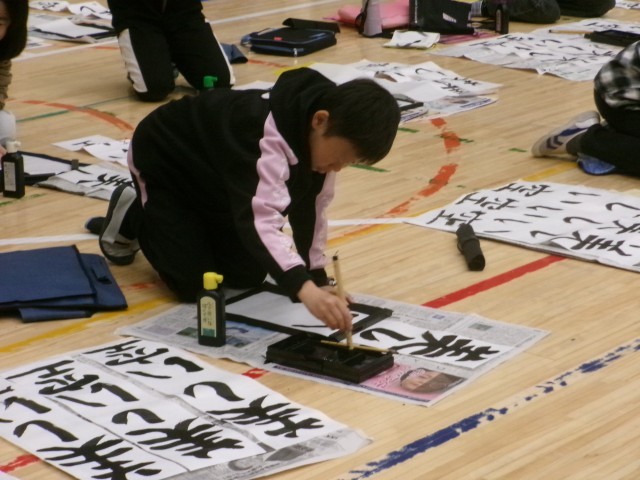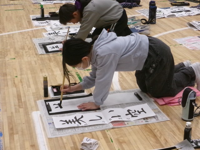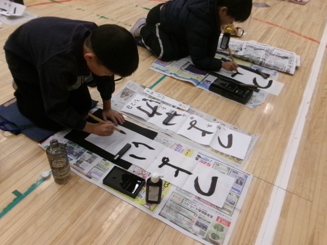 3年「つよい力」、4年「美しい空」の文字を書きました。体育館では、静かな音楽が