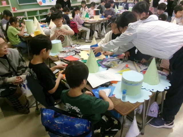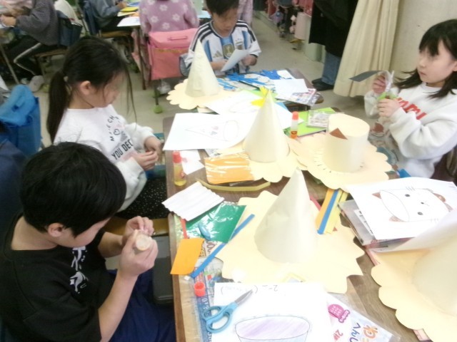 2年生は、図工「ミリーにすてきな帽子」でそれぞれ自分で考えた作品を作りました。