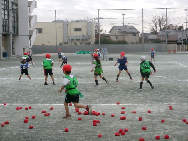 また、校庭では「宝取りおに」を行っていました。強い風の中、元気に取り組んでいました。