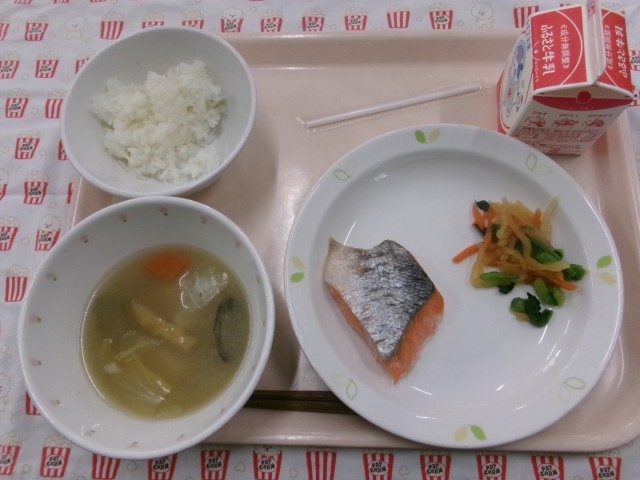 「あっさりすいとん、鮭の塩焼き、野菜のからしあえ、ごはん、牛乳」
