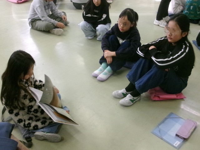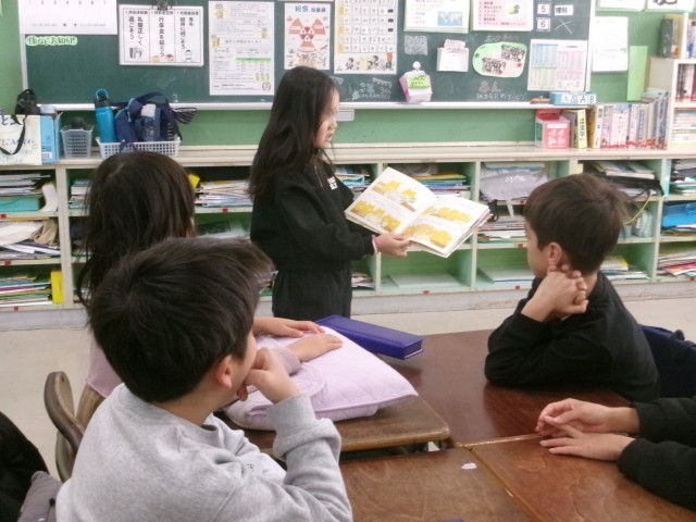 つかどん班に分かれ、各教室で2年生が選んだ本の読み聞かせを行いました。