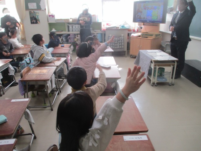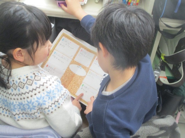 それぞれ、国語の授業が行われ、1年生はペアになってクイズのヒントを
