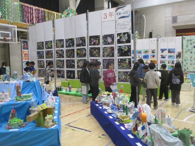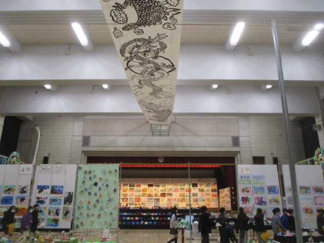 体育館では、全校児童の作品が並べられ、盛大に展示されています。各学年、平面作品と