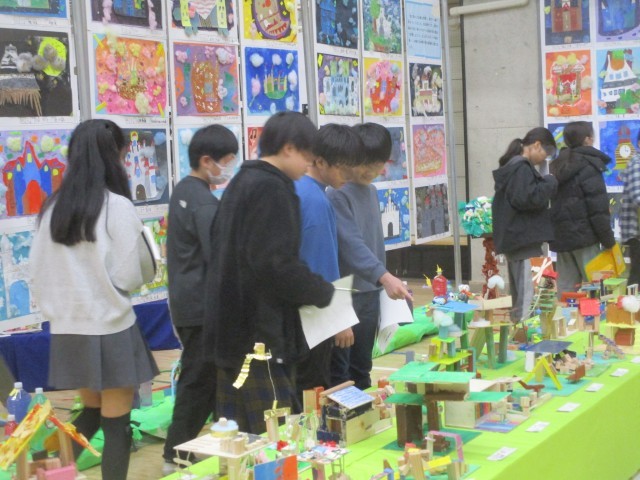 立体作品が展示され鑑賞する子どもたちも友だちの作品を真剣に見ていました。
