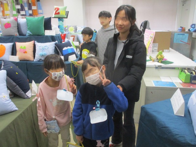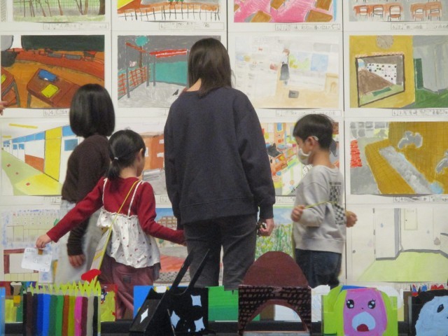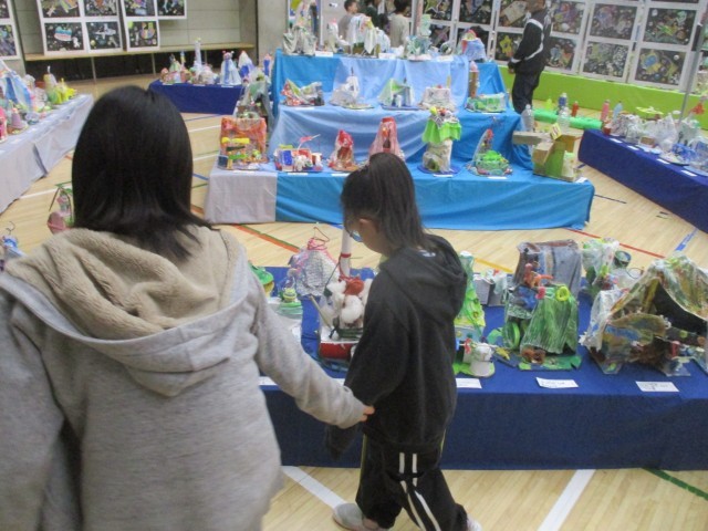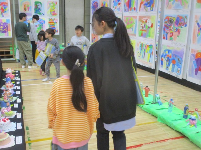 6年生は1年生と一緒に、体育館や家庭科室を回り、いろいろな作品を鑑賞しました。