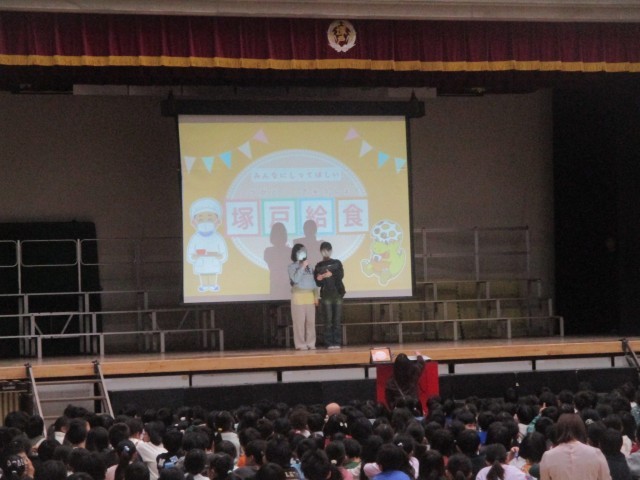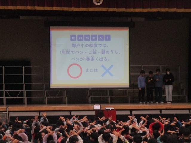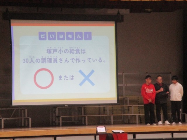 今日は、給食員会集会が行われました。給食に関する〇✕クイズが行われ、