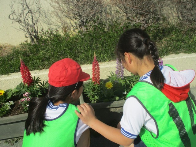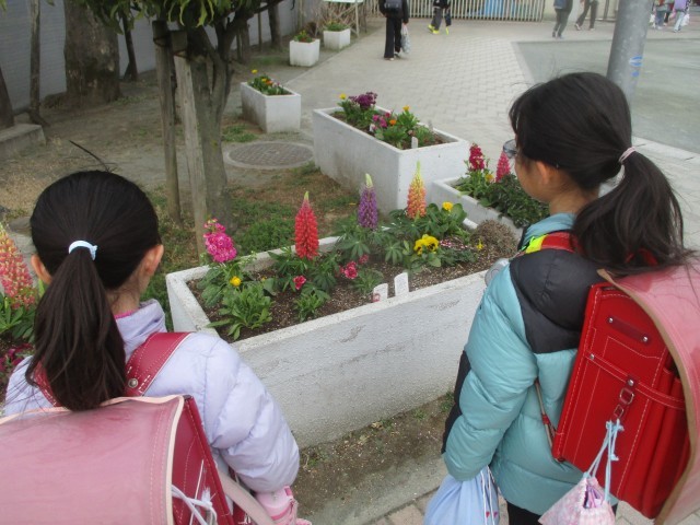 花壇を見て登校する児童や休み時間に花を見る児童がいました。