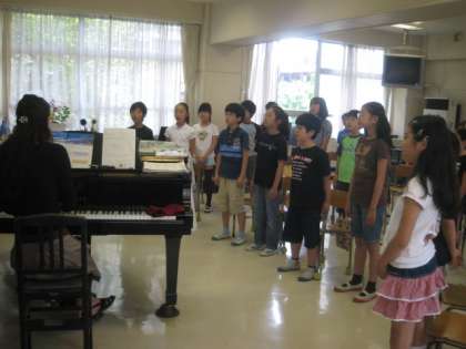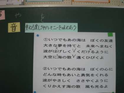 本校の音楽専科教諭は、西野教諭です。5年4組の授業でした。「音や声を重ねる楽しさやハーモニーを味わおう」という課題でした。互いの声を聴きあって歌うことで、音を重ねる楽しさを味わい、ハーモニーの美しさを感じます。「いつでもあの海は」の歌を、ソプラノとアルトで歌い音を重ねます。45分の授業で、その楽しさを感じ、歌がうまくなっていきました。子どもの感性って、素晴らしいです。