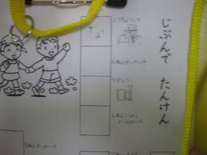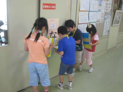 1年生は、校内を探検しながら、クイズの答えを探していきます。示された教室に、ある字が書いてあります。それを一つずつ見つけ、字をクイズの用紙に書いていくと、ある文章が生まれます。ゲーム的な要素を取り入れた探検を通して、学校の施設を学んでいきます。グループで協力してやっている1年生は、楽しそうでした。