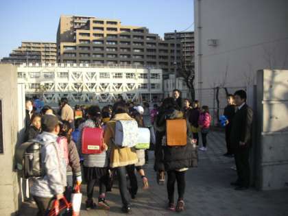 新年のあいさつで出迎える「あいさつリーダー」の子どもたちの元気な声が響き渡る中、みんな元気いっぱい登校していました。