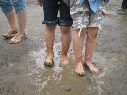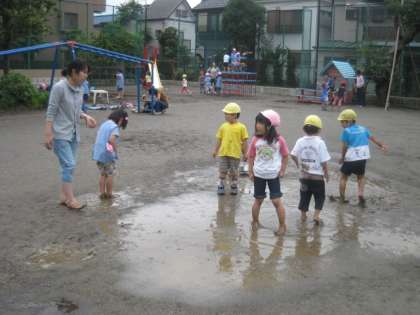 教育委員会の方が来て、塚戸幼稚園の保育の様子や園児達の様子を参観しました。雨あがりの水たまりで遊んでいる子どもたちの様子を見て、子どもらしい元気な塚戸幼稚園の子どもの素晴らしさを感じていました。