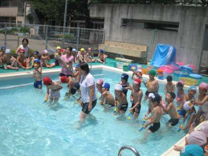 幼稚園では、今週からプールが始まりました。今日は、プール日より。年長さんは、プールで楽しくはしゃいでいました。水遊びが大好きです。