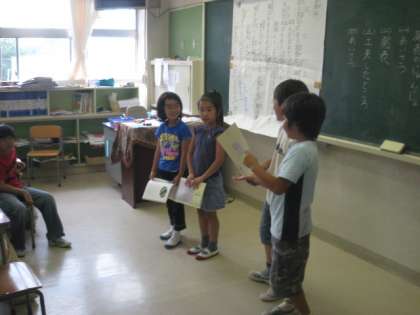 3年4組の担任は、小田教諭です。教科「日本語」の授業でした。「夏は来ぬ」の詩の意味を文意からよく考え発言していました。類推力はとても大事なことです。グループで読みを工夫しながら発表し、詩のリズムを楽しんでいました。