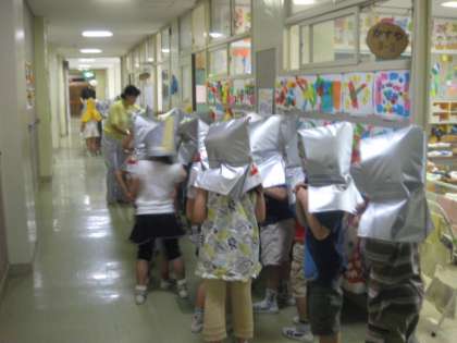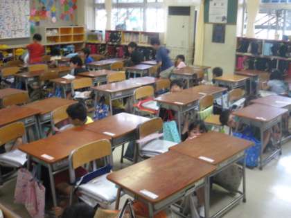 今日の避難訓練は、地震でした。放送の合図で、机の下に潜ります。そして、避難するために、防災頭巾をかぶって避難します。毎月、このようにして、避難訓練を行っています。地震、火事、不審者対応の想定で行います。