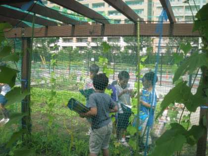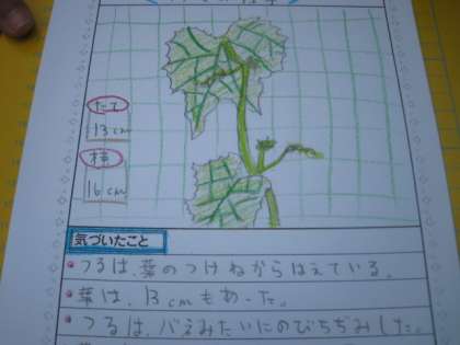 4年生は、ヘチマの観察を続けています。今年度は、工事のため、ヘチマ棚は、千歳中学校の前の花壇に作りました。秋には、雄花と雌花が咲くことでしょう。でも、成長が少し悪いのが心配です。