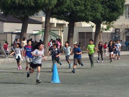 写真は今日の登校のようすと、5年生が朝マラソンをしているところです。