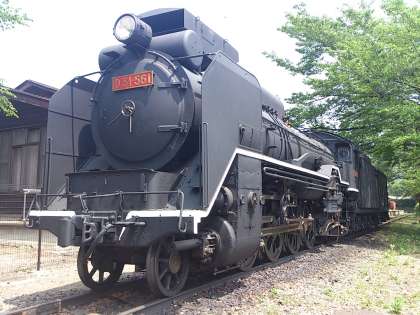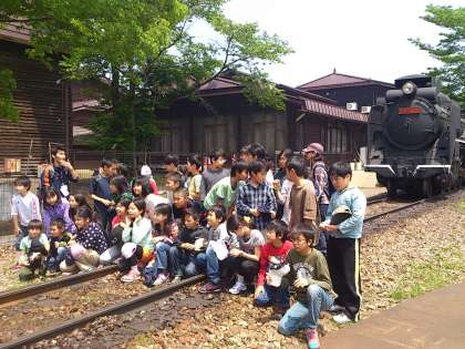 SLの前で記念撮影です。この機関車は空気の圧力で動きます。