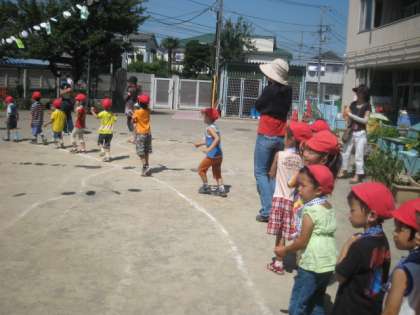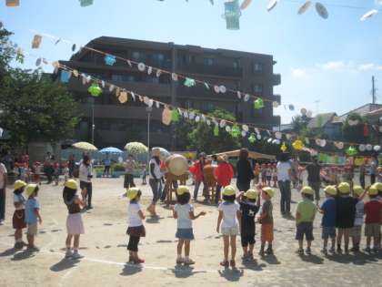 園庭では、盆踊りをしました。2曲です。お母さんのまねをして踊りました。