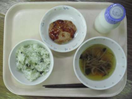 今日の給食は、「わかめとじゃこのご飯」「むろあじハンバーグ」「すまし汁」「牛乳」です。