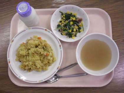 今日の給食は、「ツナピラフ」「ほうれん草サラダ」「コンソメスープ」「牛乳」です。