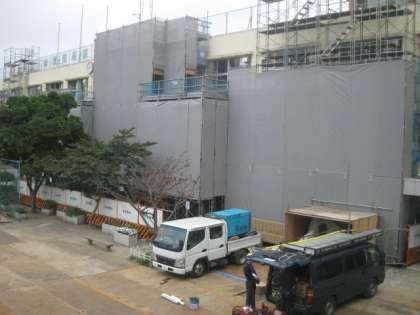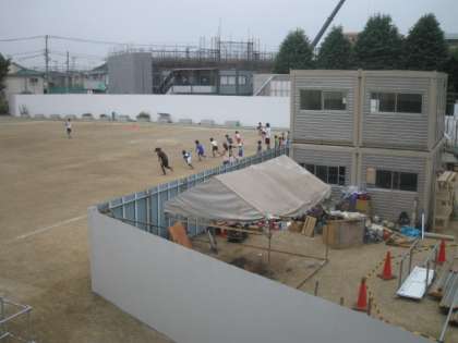 夏休みに入り、工事が本格的に始まりました。北校舎の耐震工事とクーラーの備え付けの工事です。校庭も狭くなりました。校舎内もシートがひかれ、工事関係者が出入りしています。職員員室が多目的室に変っていますので、ご注意ください。