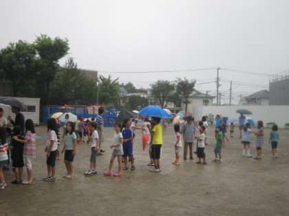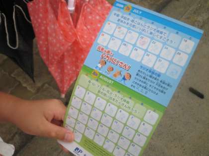 今日から10日間、朝のラジオ体操が始まりました。千歳台廻沢町会の方々が行ってくれます。7時から始まったところ、急に雨が激しくなってしまい、途中でやめることになりました。子どもたちは、カードをもらって帰りました。明日の天気はどうか心配です。
