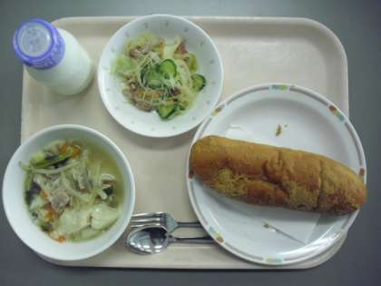 今日の給食は、「揚げパン」「ワンタンスープ」「春雨サラダ」「牛乳」です。