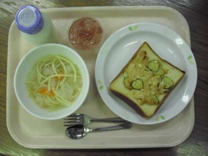 今日の給食は、「ツナトースト」「ヌードルスープ」「あじさいゼリー」「牛乳」です。