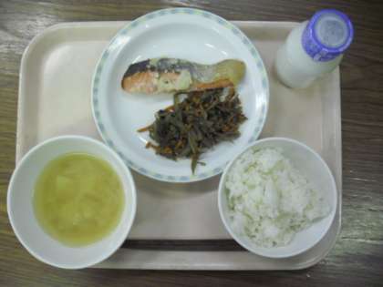 今日の給食は、「鮭の塩糀焼き」「きんぴらごぼう」「玉葱の味噌汁」「牛乳」です。