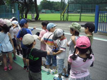 2年生が塚戸小学校の学区域に何があるのが調べに行きました。子どもたちは「千歳台・粕谷グループ」「祖師谷・上祖師谷3丁目グループ」「上祖師谷1・2丁目グループ」に分かれ、目印となる施設や公園の場所を確認しました。