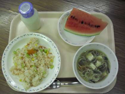 今日の給食は、「七夕ちらし」「七夕汁」「スイカ」「牛乳」です。