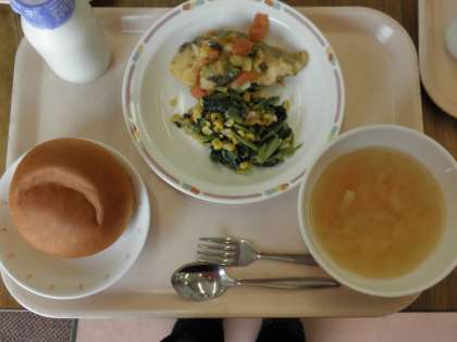今日の給食は「ミルクパン」「魚のラビゴットソース」「青菜とコーンのソテー」「コンソメスープ」です。魚のラビゴットソースは夏野菜のトマトときゅうりが入ったソースです。トマトの酸味でさわやかな味になりました。