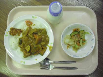 今日の給食は、「夏野菜のカレーライス」「福神漬け」「こんにゃくサラダ」「牛乳」です。