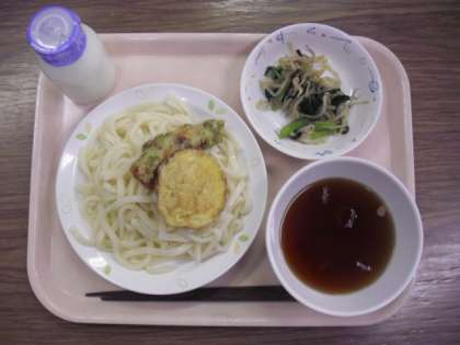今日の給食は、「冷やしつけうどん」「天ぷら(さつまいも・ちくわ)」「野菜のからししょう油かけ」「牛乳」です。