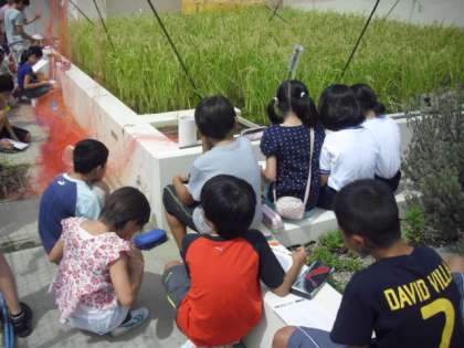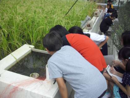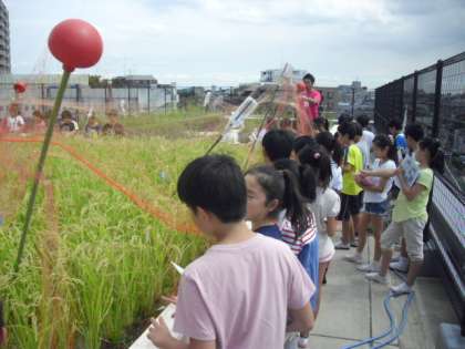5年生が田んぼの様子を観察しました。子どもたちは、田植えした頃との違いや、なぜネットか掛けられているかなど、分かったことを観察用紙に書き込みました。