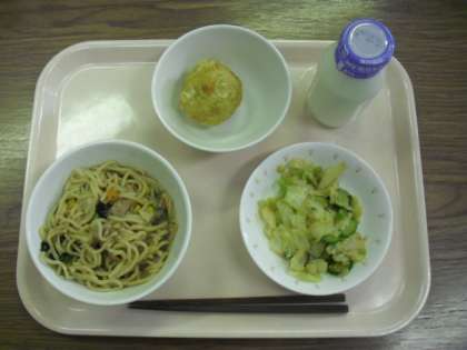 今日の給食は、「しょう油ラーメン」「野菜の中華かけ」「サツマイモのごま団子」「牛乳」です。