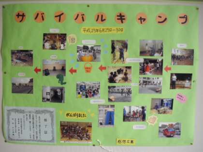 6月29・30日に行われたサバイバルキャンプの出来事を、PTAの方々が模造紙にまとめ、東校舎1階の廊下に掲示してくださいました。参加した子どもたちの感想文集も掲示してあります。