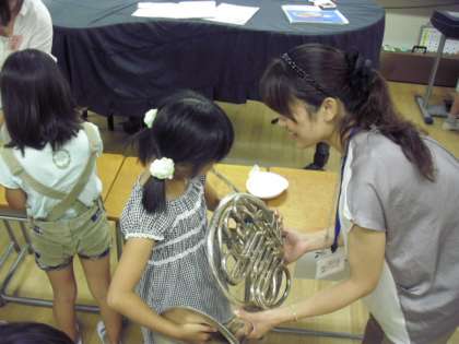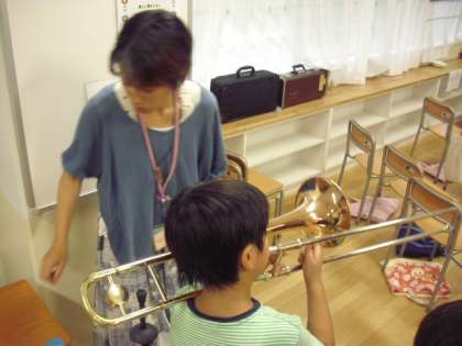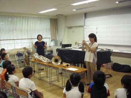金管楽器の音を聴いた子どもたちは、自分も早く吹いてみたいと興味関心を高め、実際に音が出せたときには、笑顔を見せながら嬉しそうにしていました。
