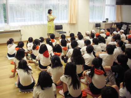 その取り組みの一つとして、山の木文庫の皆様のおはなし会が行われました。今日は4年生の日です。担当の方がお話を始めると、子どもたちは静かに集中して聞いていました。