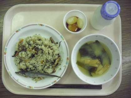 今日の給食は、「ひじきご飯」「焼きししゃも」「月見だんご」「えのきのみそ汁」「牛乳」です。